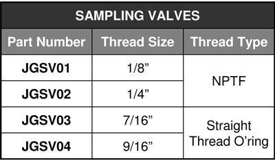 Sampling valves are available in several types for either pipe tap or straight thread O-ring installations. Refer to chart below.